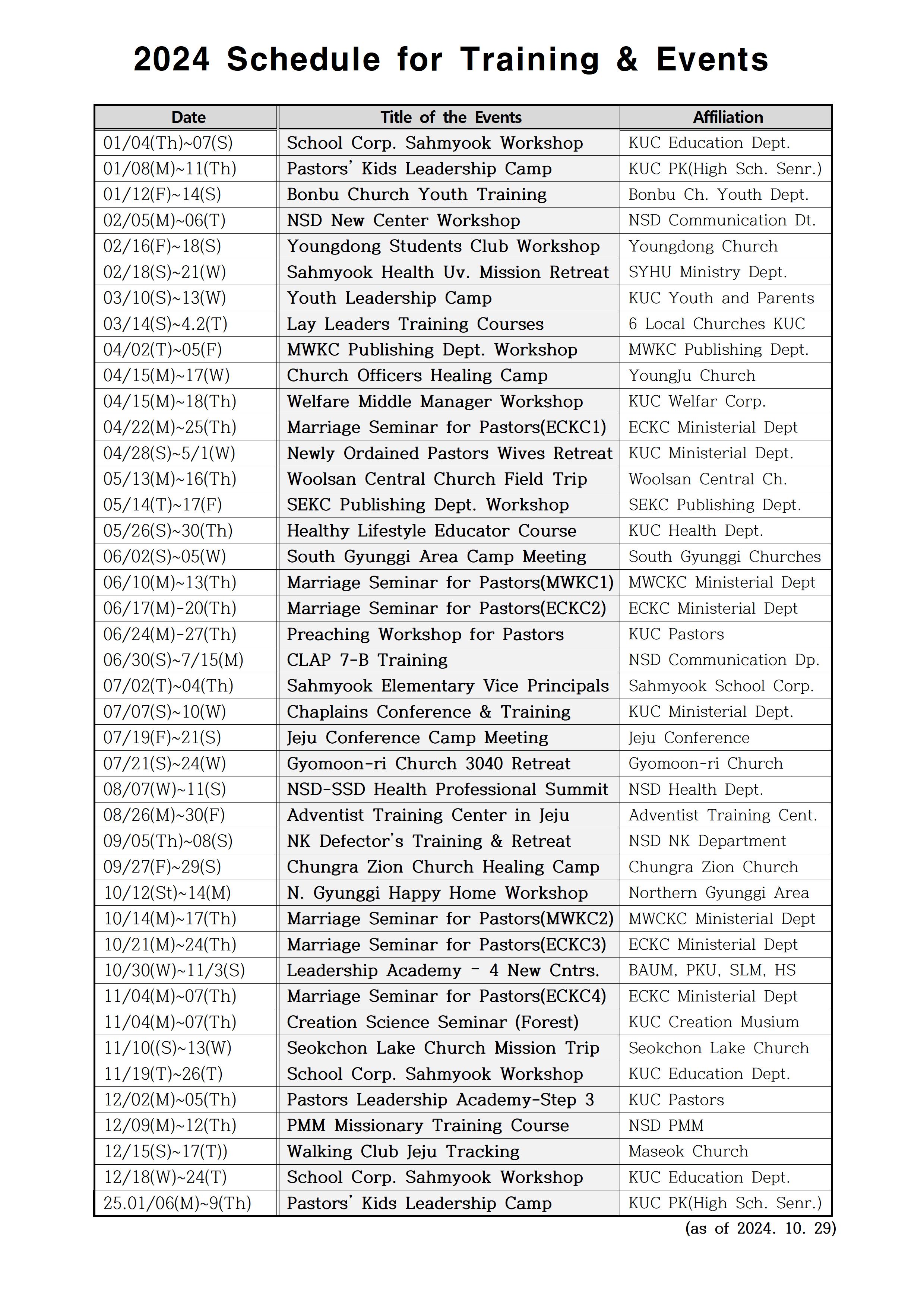Schedule for Training and Events 2024